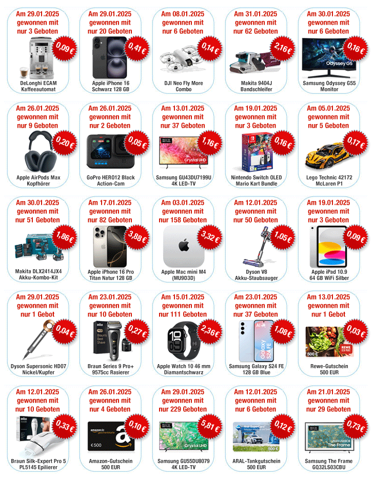 Wenn Sie die aktuellen Schnäppchen bei snipster in Erfahrung bringen möchten, finden Sie diese stets unter den beendeten Auktionen. Außerdem können Sie sich jetzt bei snipster.de kostenlos anmelden und erhalten 3 Freigebote geschenkt.